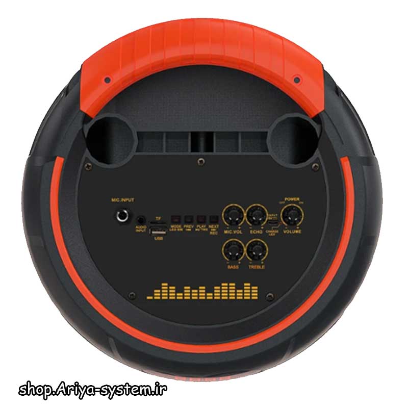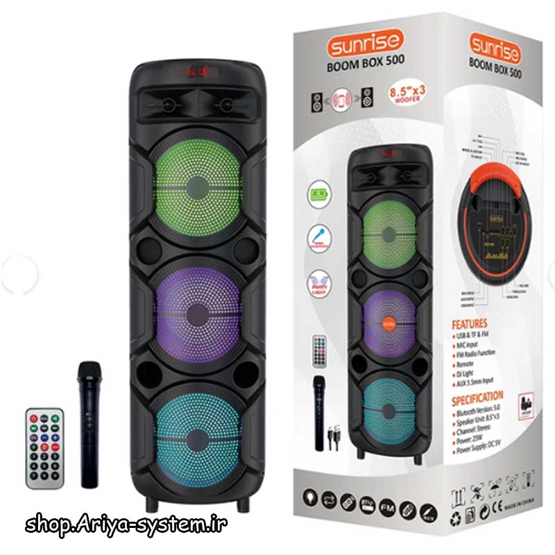 اسپیکر بلوتوثی سانرایز مدل Boom Box 500، مدت زمان پخش 2 ساعت، نسخه بلوتوث 5، منبع انرژی باتری و برق، همراه با میکروفون، ریموت کنترل، درگاه ارتباطی شامل USB، جک 3.5 میلیمتری صدا، شیار کارت حافظه، دارای نورپردازی